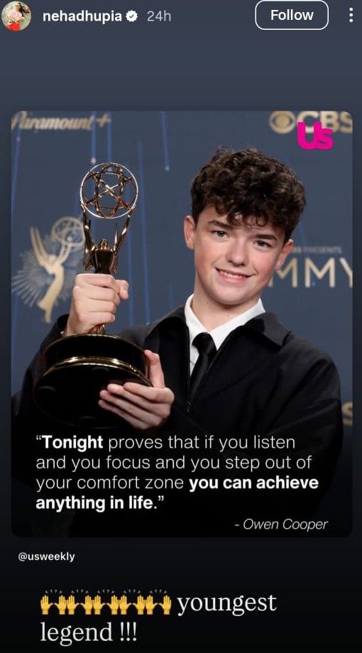 Neha Dhupia called Owen Cooper the “youngest legend” after his win at the Emmy Award 2025. She shared the post of the US Weekly outlet and hailed the achievement of Owen Cooper.