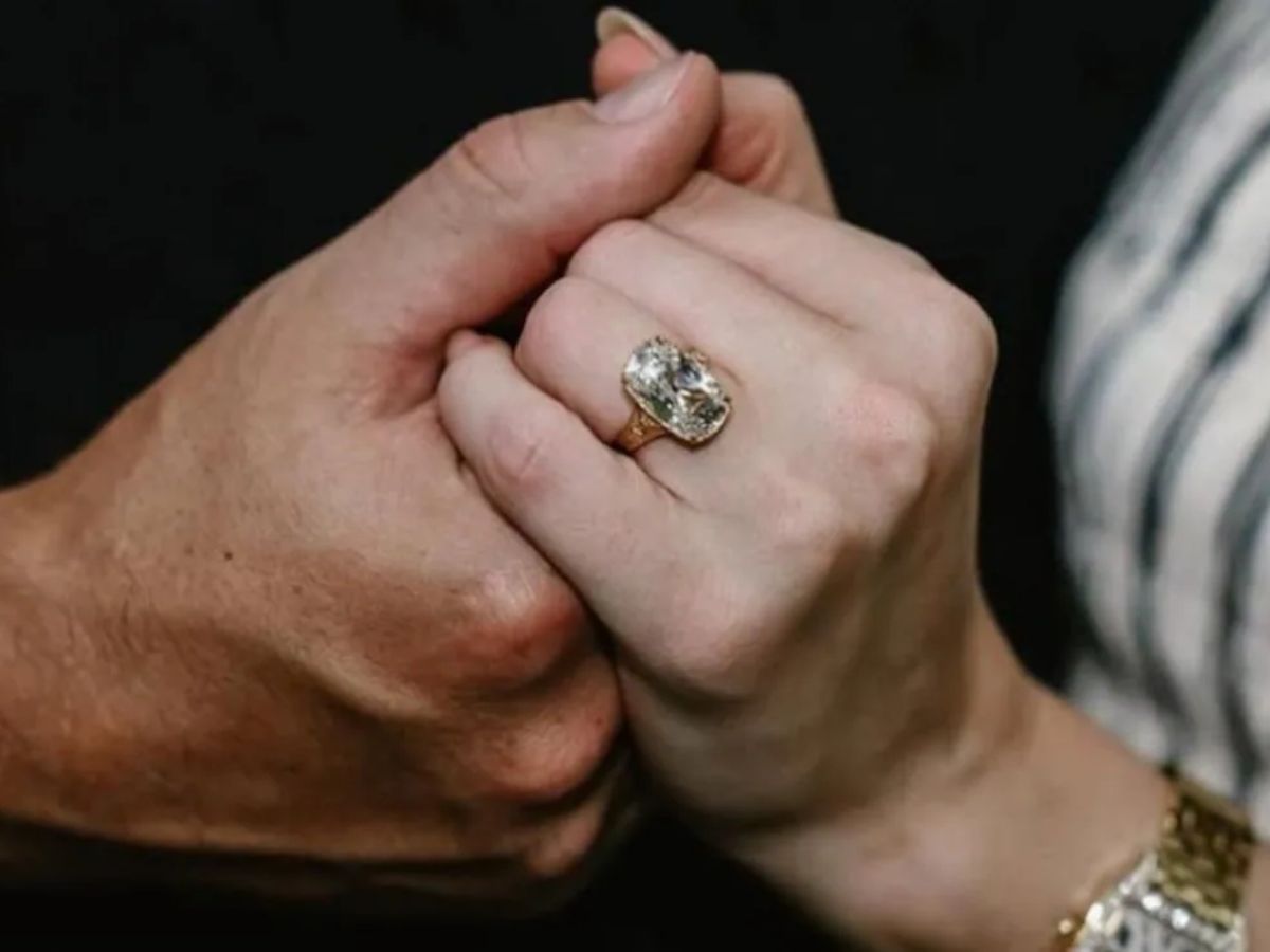 The ring is no ordinary design, it carries a vintage look, set in 18k yellow gold with delicate hand-engraved work. At its centre sits an “old mine brilliant” diamond, sometimes called an elongated antique cushion cut. Experts say the stone weighs between 7–10 carats. The cut itself is centuries old, known for its 58 facets, a high crown, small table, and large culet — features that make it glow differently from modern diamonds.