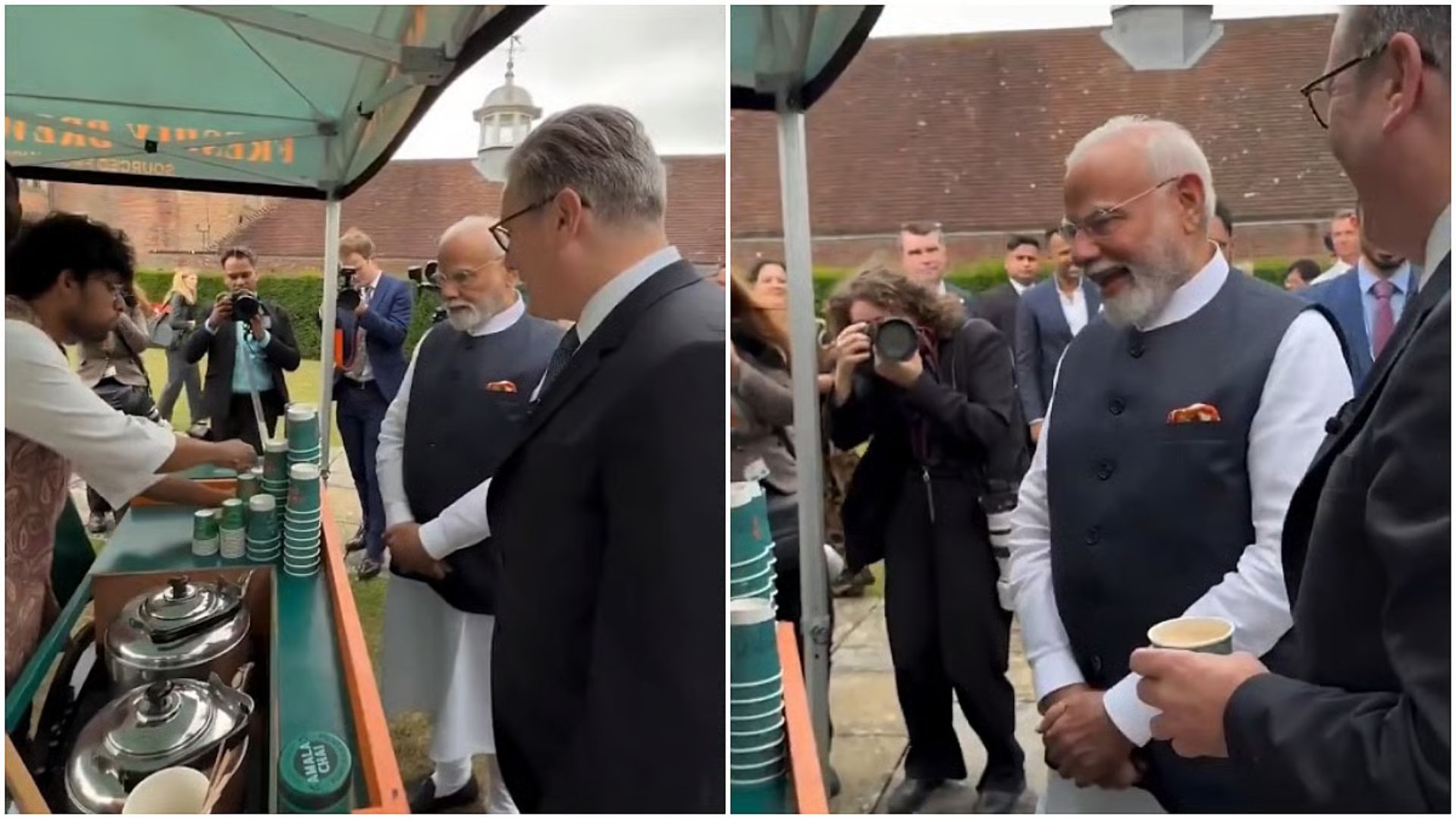 PM Modi tweeted two photos from the visit, captioning, “‘Chai Pe Charcha’ with PM Keir Starmer at Chequers. brewing stronger India-UK ties!” In one of the photos, he can be seen grasping a cup of tea, and in the other, Patel is seen in mid-pour.