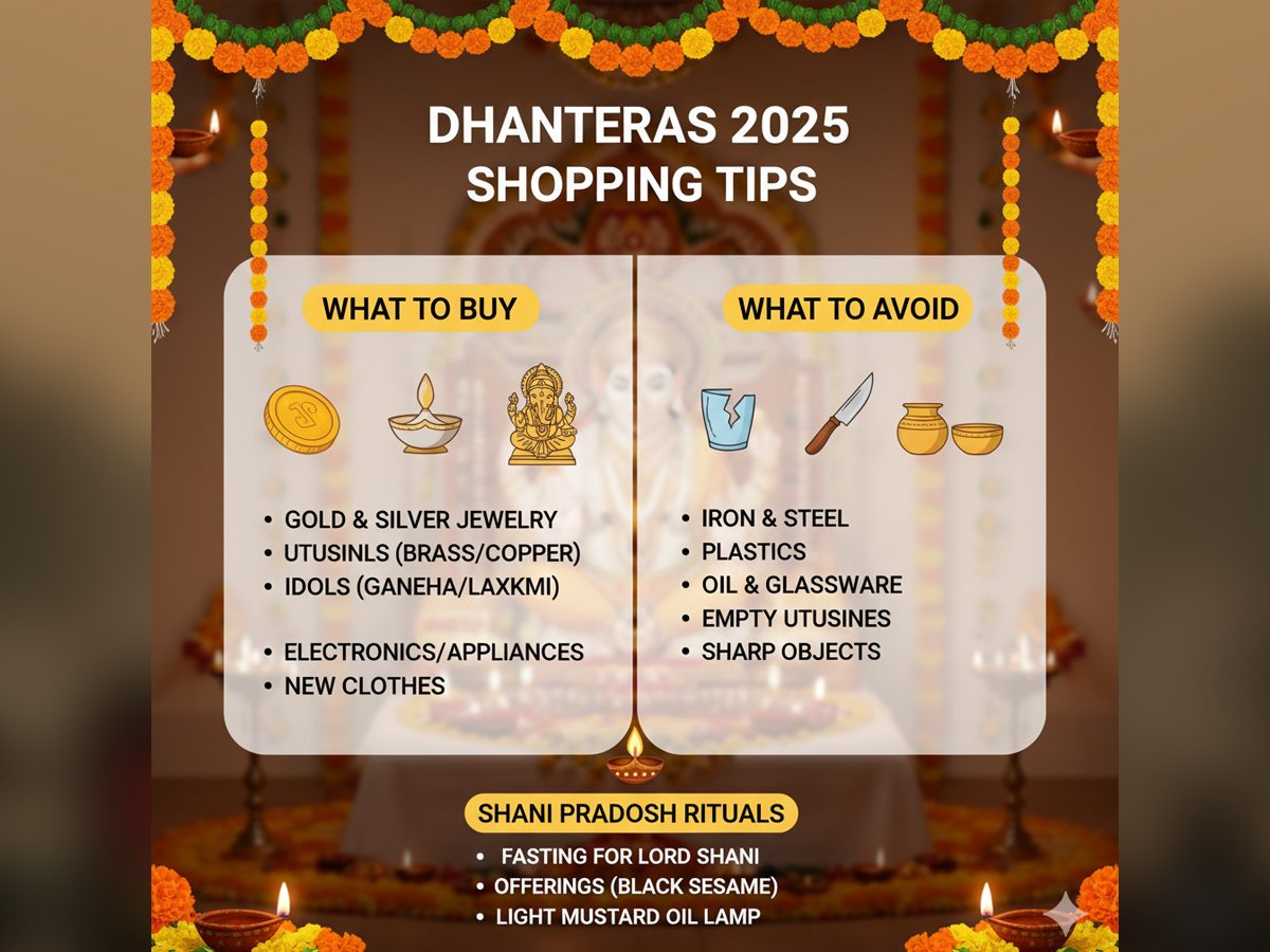 However, not all purchases are considered auspicious on every day. For example, brooms and mustard oil are advised not to be bought on Saturdays, as this year Dhanteras falls on Saturday, October 18, 2025.