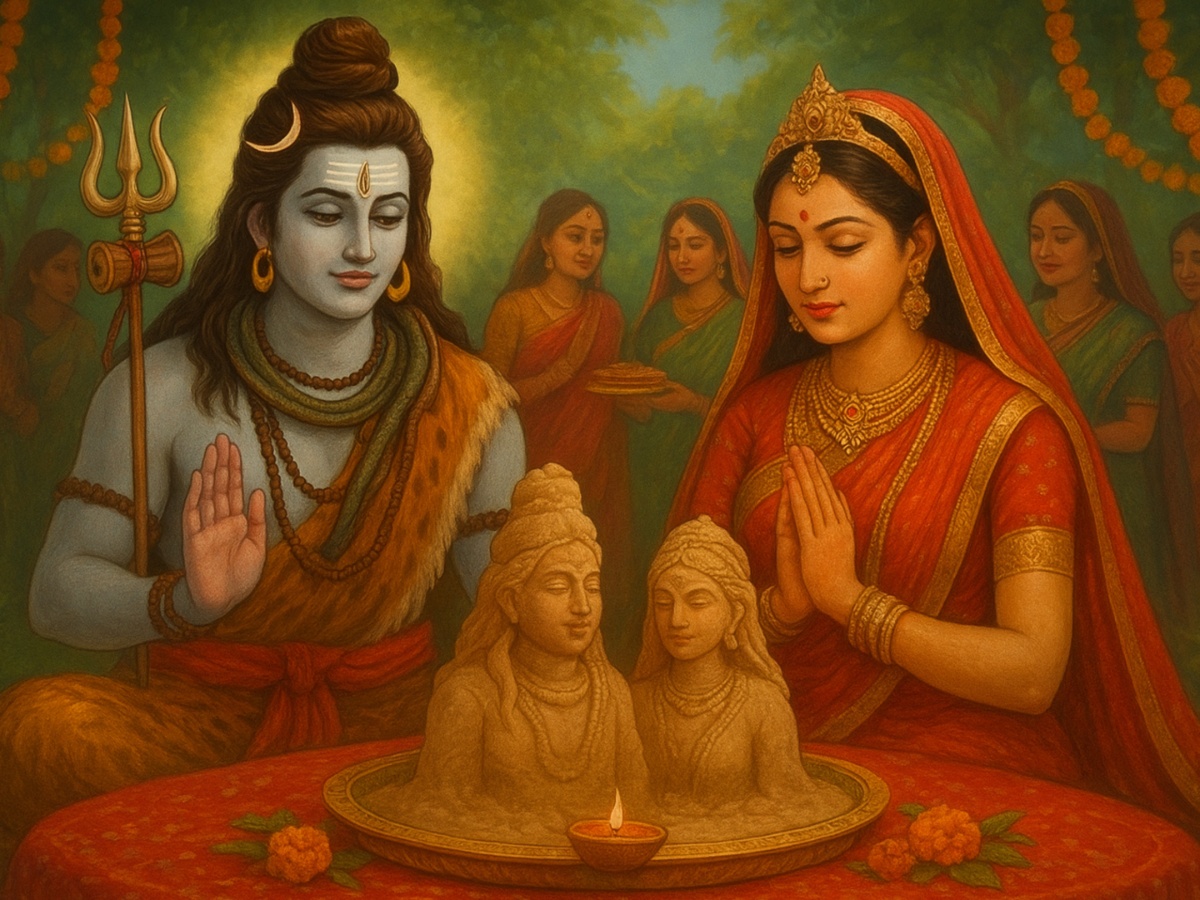 Women start the day with an early bath and dress in fine clothes. They create sand idols of Lord Shiva and Goddess Parvati for the puja. The rituals also include narrating the story of Hartalika Teej while married women observe a strict fast, often without water, to seek blessings for their husband’s long life. The fast reflects strength, faith, and devotion.