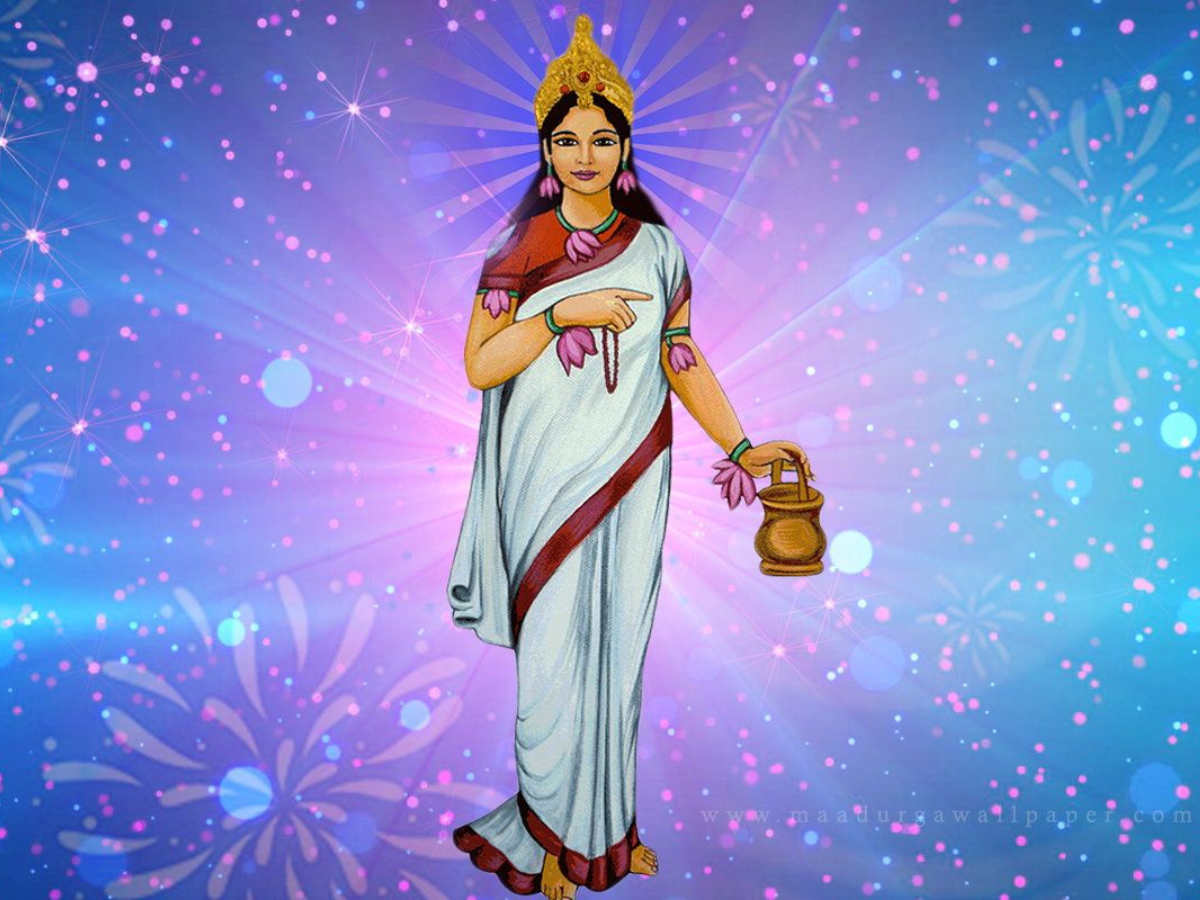 On the second day of Navratri, one pays obeisance to Maa Brahmacharini, who is shown walking barefoot, a rosary (mala) in one hand and a kamandal (water pot) in the other hand. She represents serenity, spirituality, and commitment. It is believed that the worship of her bestows on devotees self-discipline, willpower, and liberation from evil.