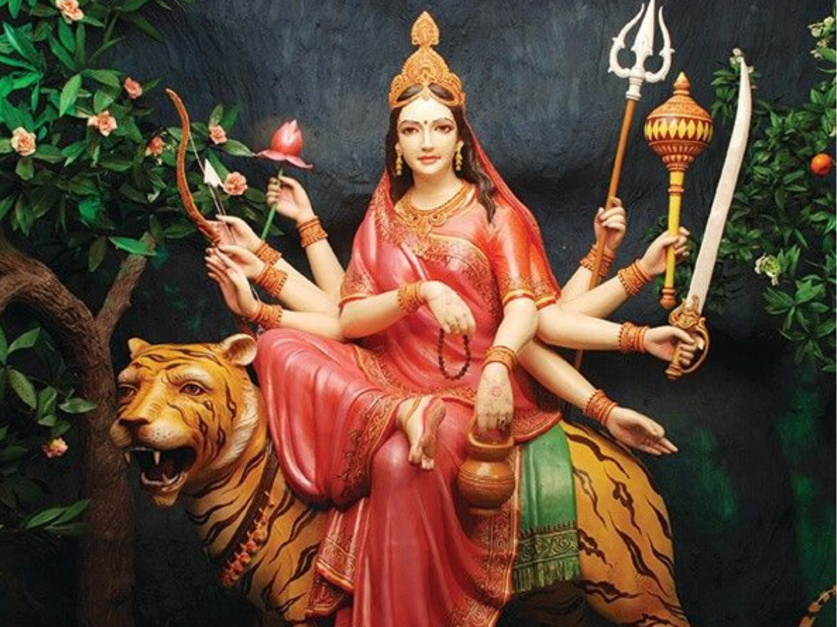 Maa Chandraghanta is the wedded form of Goddess Parvati after she marries Lord Shiva. She is so named due to her wearing on her brow a crescent-shaped moon, looking like a bell (ghanta). Portrayed with ten hands, seated on a tiger, and brandishing weapons, she represents courage, safety, and peacefulness. Her followers feel that by worshipping her, they are free from fears, negativity is repelled, and they are blessed with peace and courage.