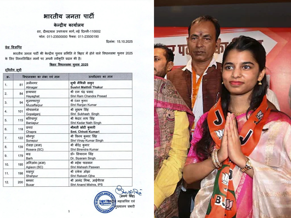 The Bharatiya Janata Party (BJP) on Wednesday released its second list of 12 candidates for the Bihar Assembly Elections 2025. The list includes singer Maithali Thakur, who will contest from the Alinagar constituency.