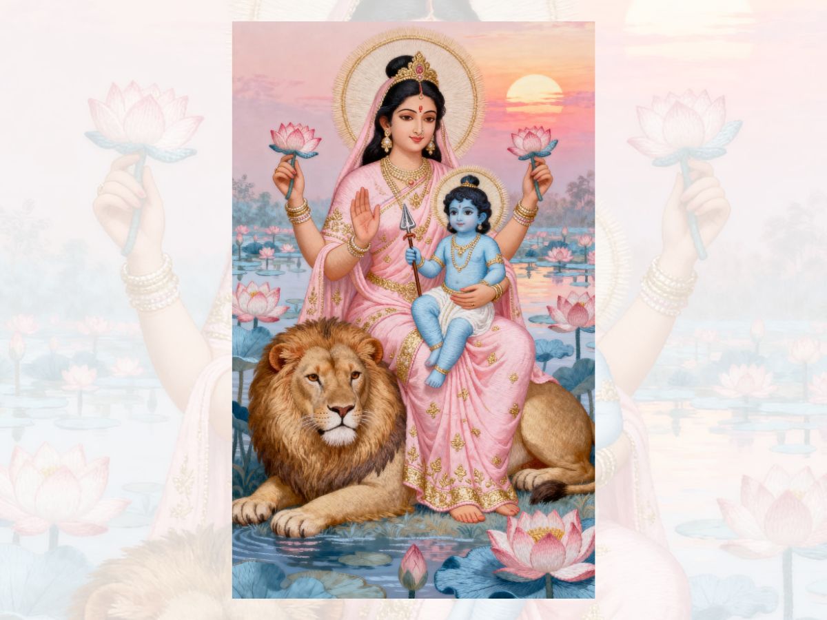 This fifth day of Navratri is dedicated to Goddess Skandamata, the fifth incarnation of Goddess Durga and mother of Lord Skanda (Kartikeya). Worshiped as the personification of motherhood and nourishing power, Skandamata is shown sitting on a lion with her son in her lap, depicting strength, kindness, and defence.