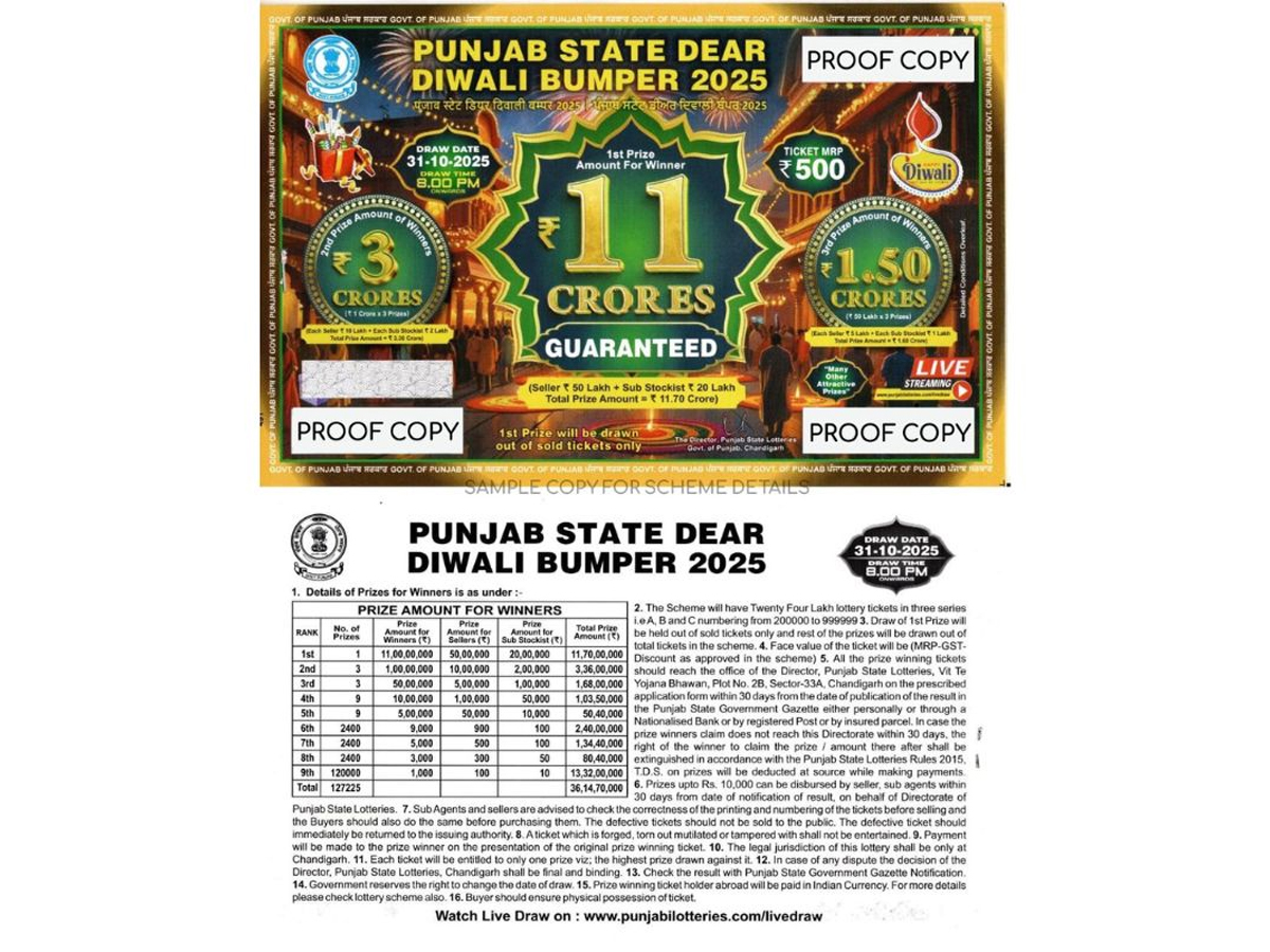The results for the Punjab State Diwali Bumper Lottery 2025 are out. The lottery draw took place in Ludhiana on October 31, 2025, at 8 PM, and the lucky winners were announced today. This year’s Diwali Bumper had a huge first prize of ₹11 crore, which makes it one of the biggest lottery draws in the country.