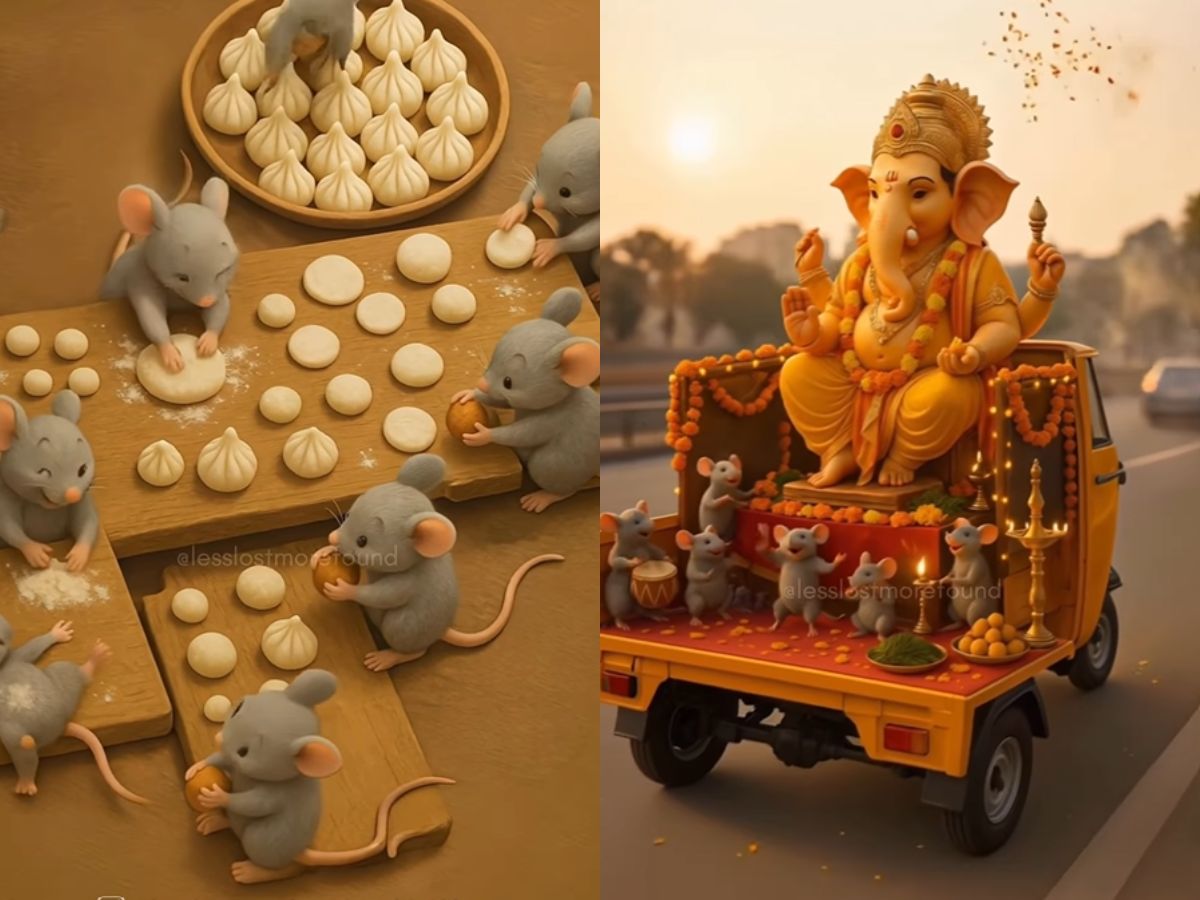 A creative video posted on Instagram by a visual storyteller depicts animated mice also called ‘mushaks’, Lord Ganesha’s sacred mount, preparing for Ganesh Chaturthi. The AI-generated video depicts the mice waking up, looking at the date on their calendar, and making preparations for the day of celebration.