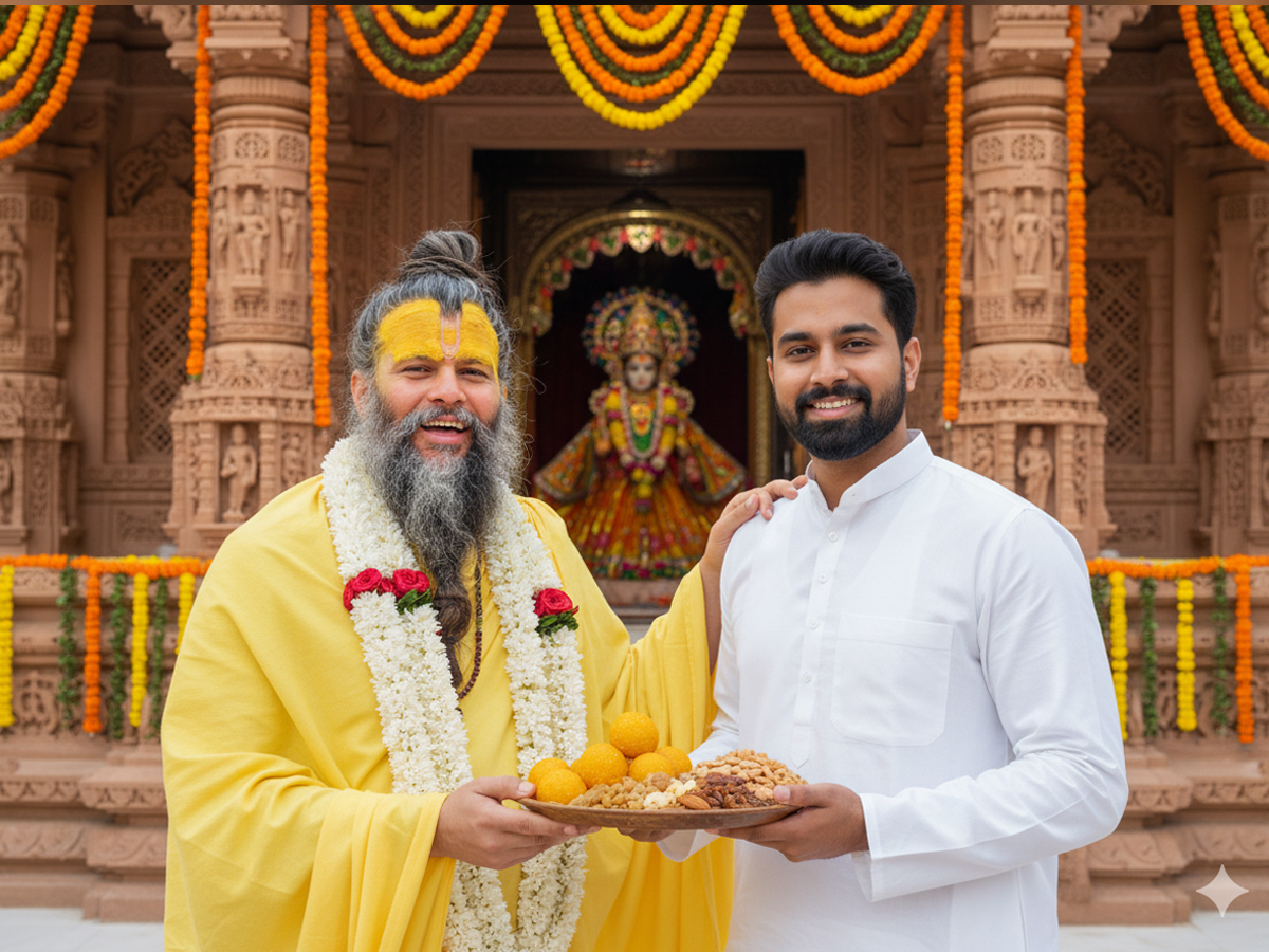“Use this reference image and create a spiritual photograph in front of a traditional Indian temple. In the image, there are two people standing together. On the left side is a saint wearing a bright yellow robe, a large white garland, and a sacred tilak on his forehead, with long hair tied up in a bun and a big grey beard. He is smiling warmly. On the right side is a young man dressed in a clean white kurta, holding offerings (laddus and dry fruits) in his hands. The saint has his hand gently placed on the young man’s shoulder, showing blessings and affection. In the background, the temple architecture is visible with carved stone pillars, colorful flower decorations, and a deity idol inside the sanctum. The atmosphere is spiritual, festive, and divine, with natural lighting and vibrant colors. The saint’s face should be the same as in the first given image, and the young man’s face should be the same as in the second given image, blended naturally with realistic lighting.”