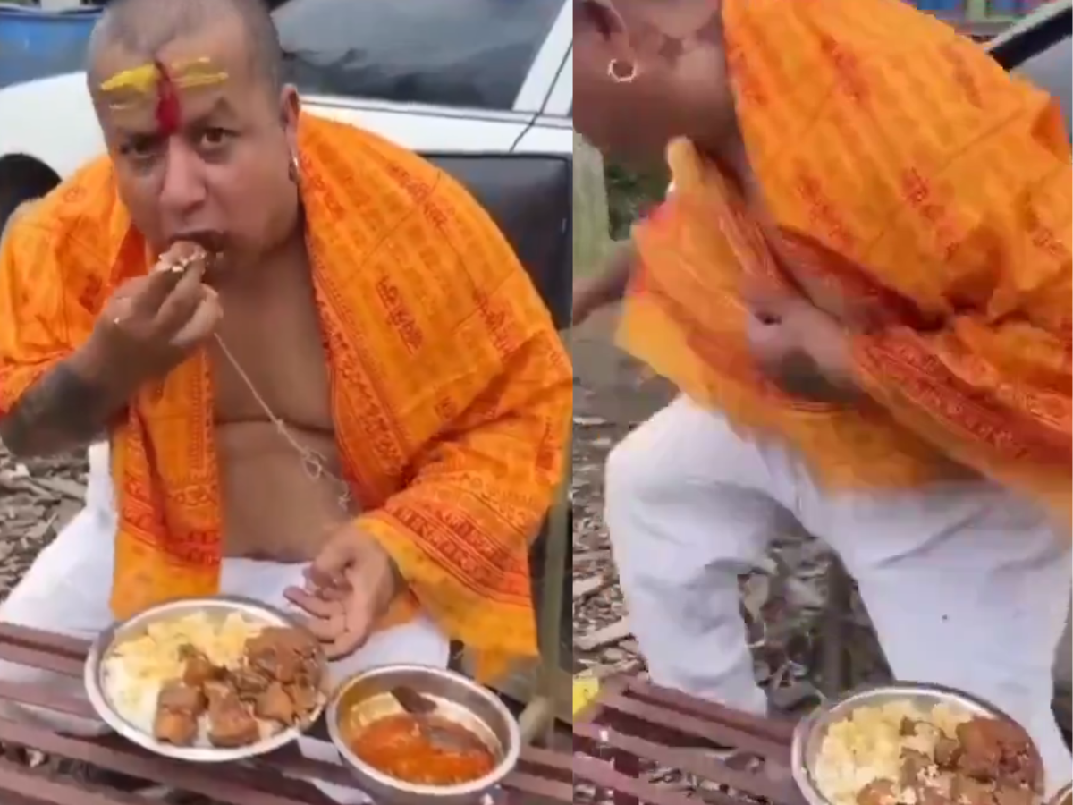 During the current Navratri festivities, a video was shared on social media in which a man is seen wearing Bhagwa-colored clothes, with a tilak mark on his forehead and a saffron gamcha over his shoulders. In the video, he is reportedly consuming non-vegetarian food and trying to escape when he is caught on camera. But all of these allegations are untrue.
