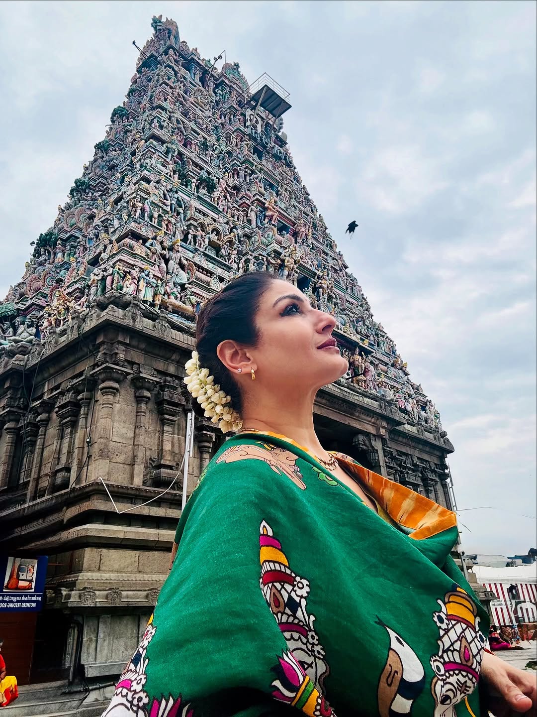 Raveena Tandon’s Soulful Visit to Meenakshi Temple Sparks DevotionRaveena Tandon’s Soulful Visit to Meenakshi Temple Sparks DevotionRaveena Tandon visited Meenakshi Amman Temple in Madurai. She went to seek blessings and peaceShe thanked the goddess with a heartfelt post. Her caption read: “Thank you for the blessings.”Raveena wore traditional clothes and jasmine flowers. She looked calm and respectful at the templeThe temple honors Goddess Meenakshi and Lord Shiva It unites different Hindu traditions in one placeRaveena recently celebrated 24 years of her film ‘Aks’ She shared memories from the special dayShe acted in hit shows and movies like ‘Aranyak’ and ‘K.G.F: Chapter 2’ Her new film with Suriya is coming soonFans loved her spiritual post and praised her grace Her faith inspires manyRaveena’s visit shows her strong cultural roots Her peaceful prayers touched many hearts