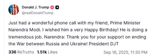 “Just had a wonderful phone call with my friend, Prime Minister Narendra Modi. I wished him a very Happy Birthday! He is doing a tremendous job. Narendra: Thank you for your support on ending the War between Russia and Ukraine! President DJT,” the post read.